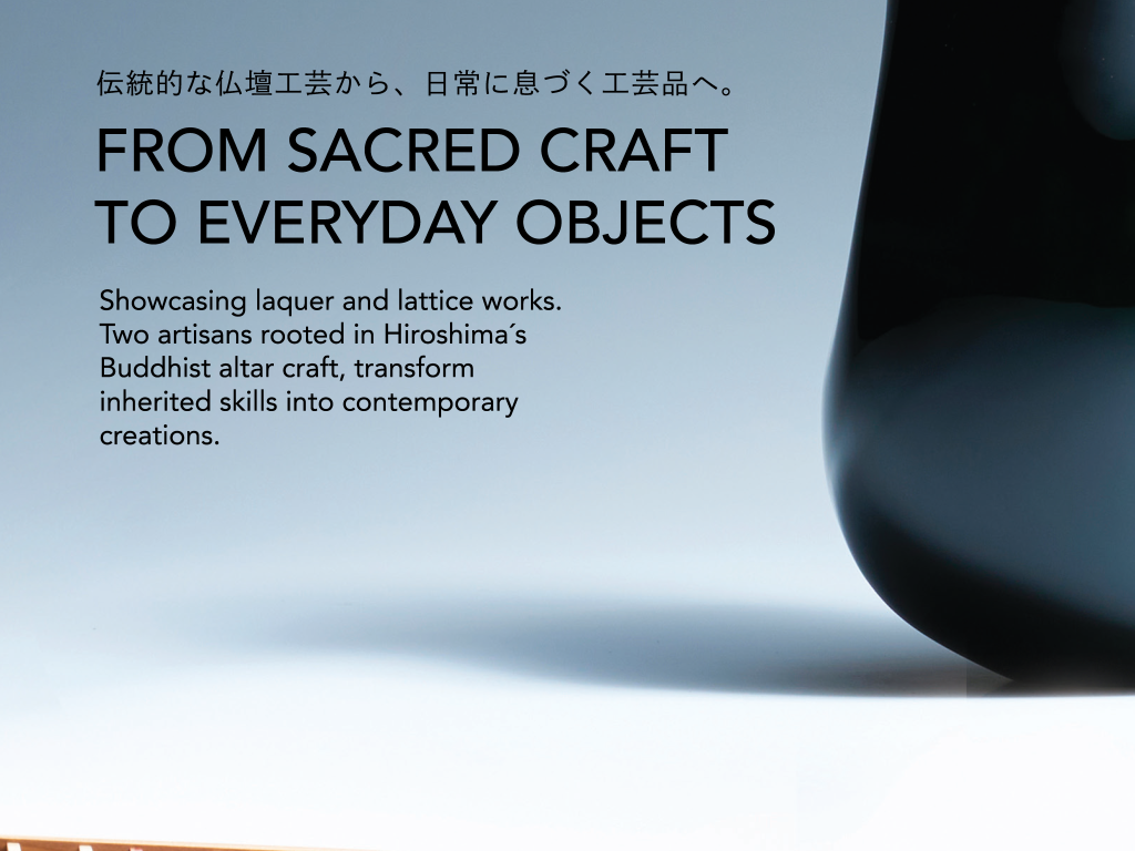 2025年11月1日(土)から14日(金)まで、広島県廿日市市 宮島の「まる福物産」 1階イベントスペース (広島県廿日市市宮島町 520-1) にて、 広島の伝統工芸「広島仏壇」に携わる二人の作家に焦点を当てた展示販売イベント 「HIROSHIMA CRAFTS」 を初開催いたします。 本展は、「FROM SACRED CRAFTS TO EVERYDAY OBJECTS-伝統的な仏壇工芸から、 日常に息づく工芸品へ。」をテーマに、広島仏壇の高度な技術を受け継ぐ二人の工芸家が、 受け継がれた手わざを現代の暮らしに調和する造形・日用品へと昇華させた作品を紹介します。 出展作家は、伝統的な仏壇塗の技法をもとに現代の器やオブジェを制作する塗師・高山尚也と、 精緻な組子細工を用いて家具や日用品を手がける組子師・上高成道。 それぞれが異なる手法で、広島仏壇の精神と技を未来へつなぐ新たな工芸のかたちを提示します。